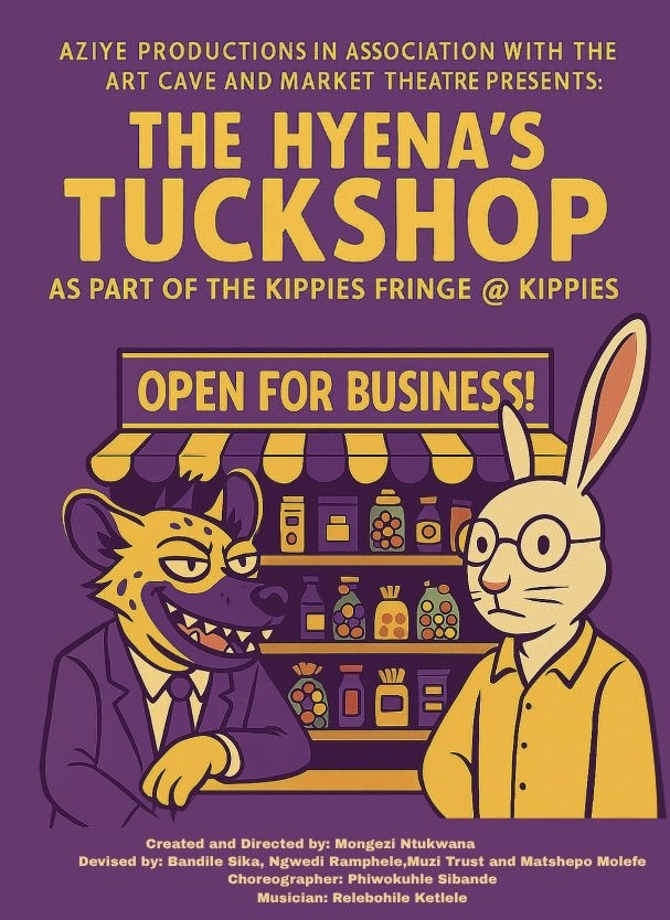 The Hyena’s Tuckshop is an allegorical children’s theatre piece in which a sly hyena runs a bogus tuckshop selling dangerous, low-quality goods that leave children sick and confused. A quick-witted rabbit uncovers the scheme, guiding young audiences through a playful but pointed lesson on food safety and accountability. Inspired by real incidents where substandard goods led to the deaths of children, the production balances humour, storytelling, and social awareness. Originally staged at the National Children’s Theatre during the Young Directors Festival with a child cast, the show later moved to the Kippies Fringe, where it played to sold-out audiences.